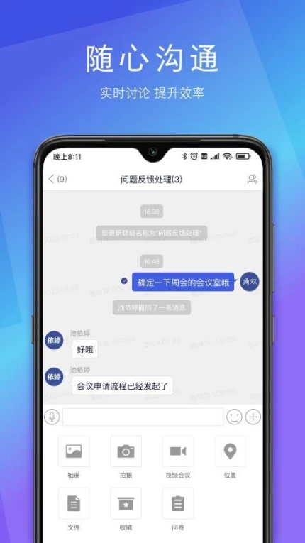 支持群组实时讨论,助力用户工作高效协同,深度结合各项业务。