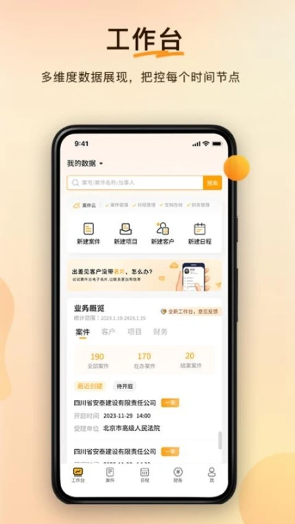 案件云免费版是一款专注于法律行业的效率办公工具,支持案件信息云端存储、客户档案数字化管理及工作日程智能规划。用户可通过新建项目快速录入案件详情,利用收支数据模块追踪律所财务流动,结合团队协作功能实现多成员任务分配。应用内置智能通知系统,可自动提醒关键时间节点,确保案件流程有序推进。v1.4.4版本升级后,案件阶段展示更清晰,操作流畅度显著提升,成为律师日常办公的得力助手。