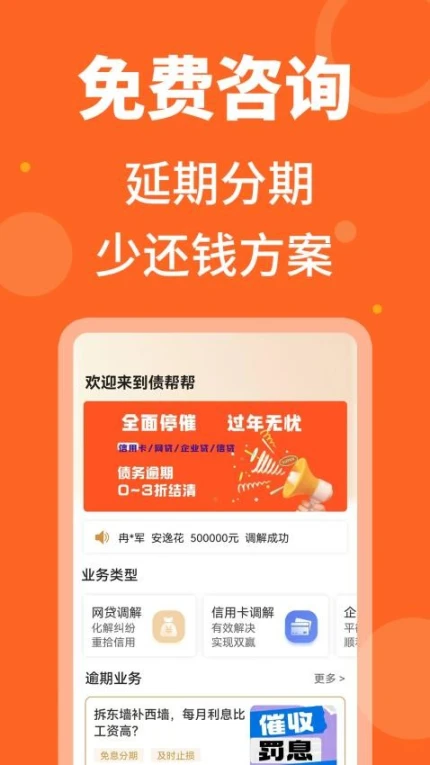 蓝天下载站为您免费提供债帮帮官方版下载。这款生活实用类应用专为逾期用户提供债务管理解决方案,支持在线协商、分期还款及征信保护。平台通过定制化服务帮助用户清晰认知负债状况,制定科学还款计划,避免催收风险。