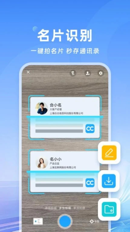 集名片扫描、云端保存、信息导出、分享、搜索人脉和分组管理等多种功能于一体,满足用户多样需求。