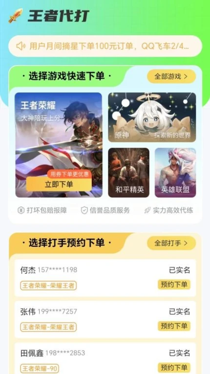 1.游戏覆盖广泛,为众多热门游戏平台提供代打服务,代打需求轻松得以满足。