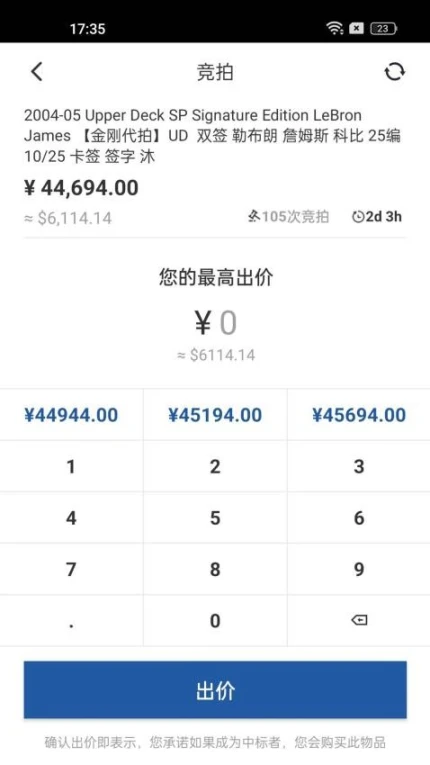 6、利用线上竞拍功能,为心仪球星卡竞拍出价。