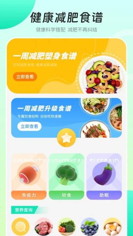 1、智能饮食规划:根据用户设定的减肥目标,自动生成包含早餐、午餐、晚餐及加餐的完整饮食方案。