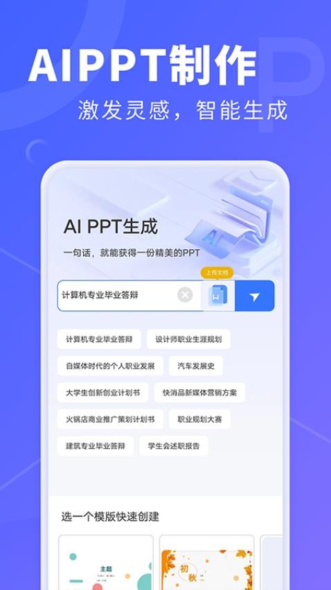 蓝天下载站为您免费提供AiPPT官网版下载,这是一款基于智能AI技术的PPT生成工具。用户可通过输入关键词快速生成PPT框架与摘要内容,支持素材模板选择与大纲编辑功能。应用内置海量模板与丰富素材库,满足多场景办公需求。系统优化后运行流畅,操作界面简洁直观,适合快速完成高质量PPT制作。