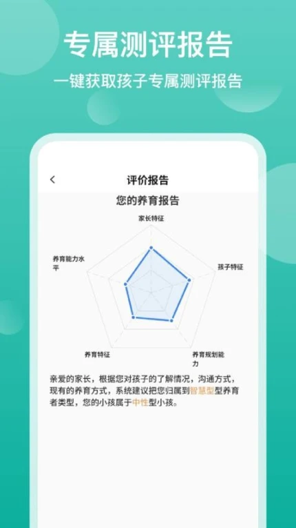 5.评价报告功能,查看养育孩子评价报告,分析养育方式,掌握孩子特征,科学养育。