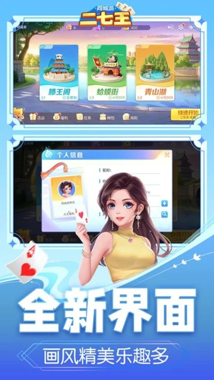 同城游二七王是一款广受欢迎的棋牌桌游,为玩家带来丰富的游戏体验。它起源于湖南,在南昌地区受到极大关注并走红。游戏具有独特的规则,将大王、小王、2、7设定为常主,这一规则使得游戏玩法更加新颖有趣。其画面风格简约舒适,能让玩家在游戏过程中感受到轻松愉悦的氛围。玩家在游戏中可以体验到正统的玩法,一人为庄家,其余三人为闲家,通过叫分来确定庄家,叫分最低者获得底牌并确定花色。这种规则增加了游戏的策略性和趣味性,玩家需要根据手中的牌型和局势进行合理叫分。此外,游戏还提供多种扑克牌玩法,如德州扑克、斗地主等,满足不同玩家的需求。支持在线联机对战模式,玩家可以和好友或其他玩家一起玩游戏,提升了游戏的互动性和可玩性。高清画面和逼真声效,让玩家仿佛置身于真实的牌桌前,带来身临其境的游戏体验。
