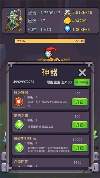 使用金币和其他元素即可升级神器,方式简单便捷,助力玩家提升战斗能力。