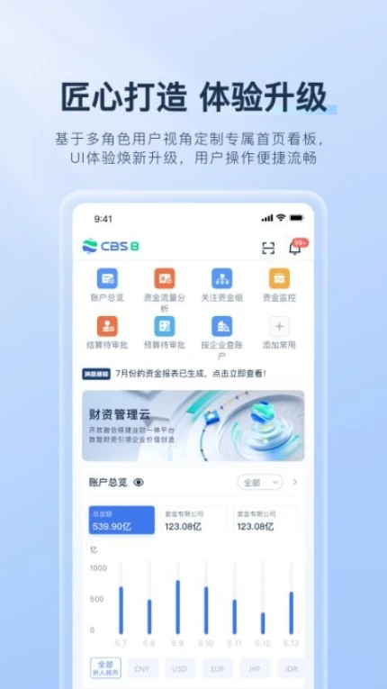 CBS最新版是一款功能丰富的移动财资管理软件,为企业财务官带来了极大的便利。它具备多种实用功能,如财资管理可远程查询全球资金信息,流程审批能在线设置关注流程。资金趋势通过图形化展示,让用户快速获取动态信息。账户视图详细展示资金账户,方便了解情况。还有专属财资专家赋能管理,以及资金控制功能,让使用更便捷。其特色在于满足多场景需求,支持精准高效决策,提供智能强大的金融服务。还能自定义推送消息,快速审批流程,保障账户信息安全。