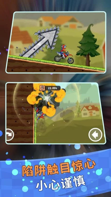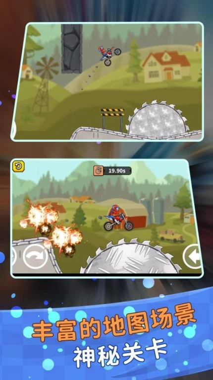 1、玩家驾驶摩托车在不同场景中冒险,运用飞跃、漂移、加速等操作提高速度,快速抵达终点。
