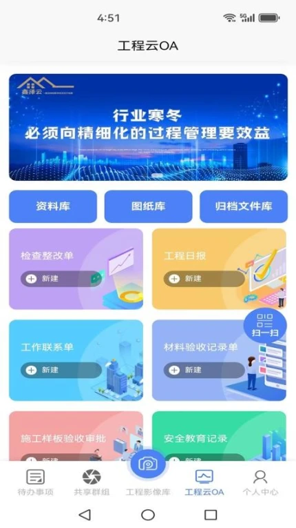 工程云相机app专为工程施工领域打造,是一款功能强大的效率办公应用。它可以全过程记录项目工程影像,让用户随时随地拍摄带有详细信息的水印照片,精准记录项目名称、照片类型和工程信息等。平台提供线上共享群组,用户可建立群组实现多人共享水印照片,促进协同办公。同时,还配备企业OA办公系统,方便用户随时审批待办业务,实现快捷办公。
