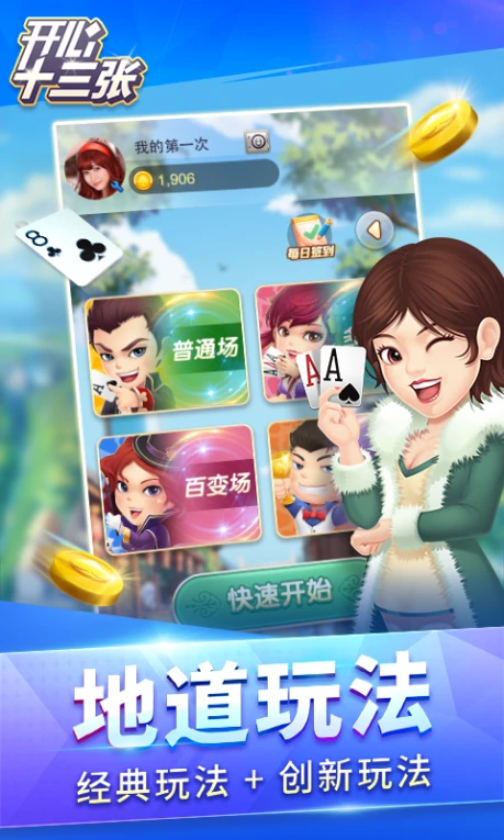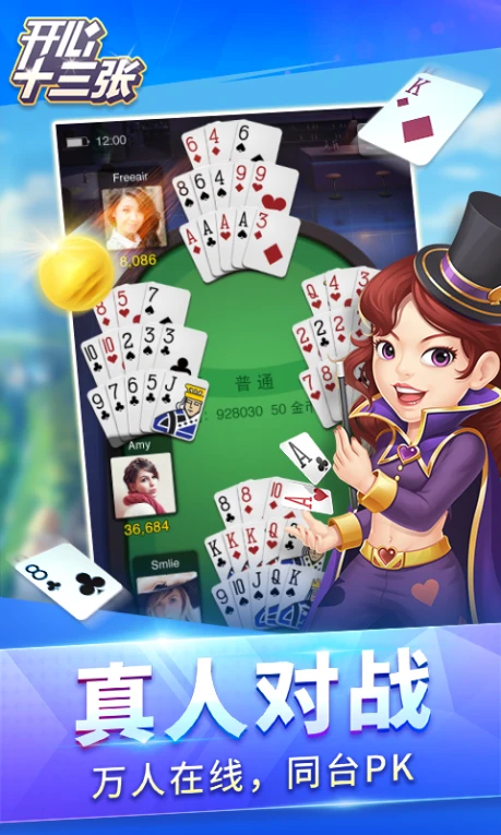 开心十三张安卓版是一款很好玩的手机端卡牌游戏,这个游戏玩法独特,操作十分简单。在这个游戏当中,每位玩家将拥有十三章卡牌,玩家需要从小到达按照3、4、4的方式进行排序,与对手进行比牌,谁的牌比较大谁就能胜利。这里都是真人对战,万人在线,同台PK,胜者为王。