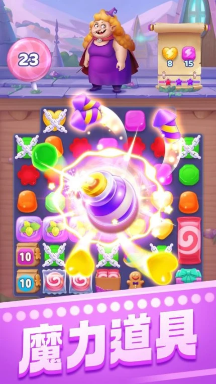 融合三消基础与军旗策略规则,新增甜蜜导弹、彩虹糖罐等特色道具,突破传统消除模式。