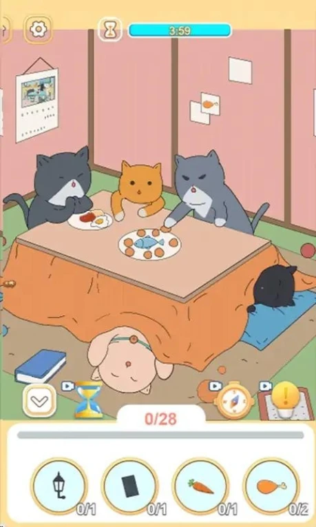有点费眼睛采用清新卡通画风构建多样化主题场景,每个关卡隐藏四个目标物品等待玩家发现。系统支持点击确认机制,操作简单易上手,时间限制与道具系统形成动态平衡。游戏内含草莓、苹果等甜品元素及多色系猫咪角色,通过差异化视觉设计提升观察难度,适合碎片化时间放松解压。