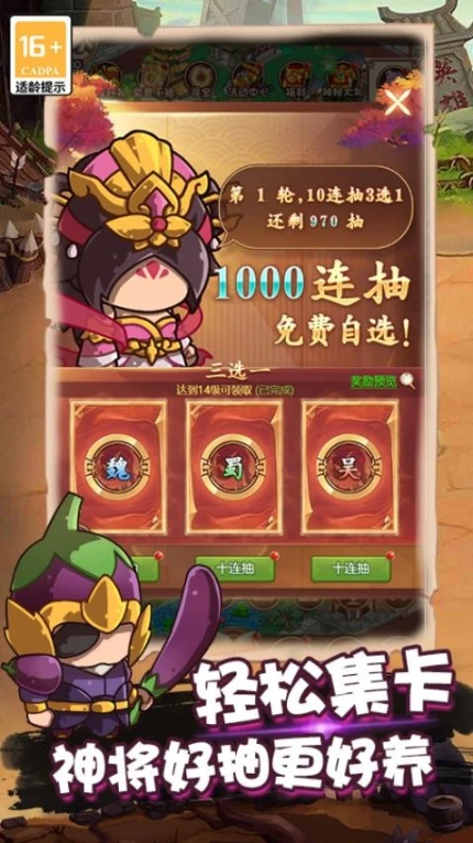 1、登录即送千抽福利,日常挂机可获稀有武将材料,零氪金玩家也能快速组建强力阵容。