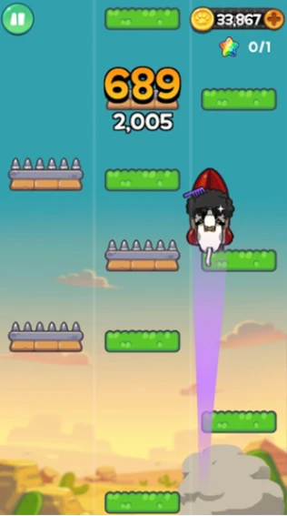 玩家控制小猫不断向上跳跃,突破更高分数,可获取丰富的游戏奖励,激励玩家挑战自我。
