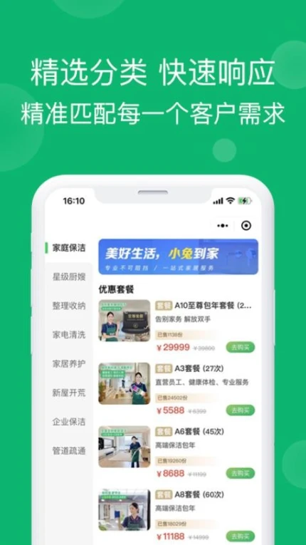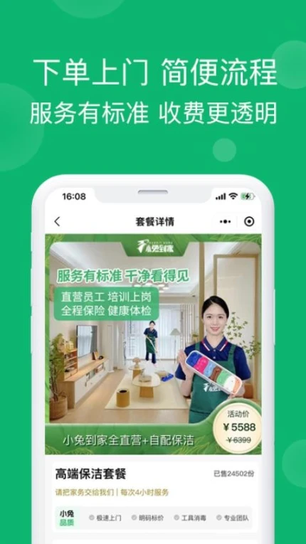1. 上门服务:足不出户享受专业家政服务,覆盖家庭清洁、家电维护等场景。2.精准匹配:智能推荐符合用户需求的服务项目,提升选择效率。3.收费透明:价格公开可查,避免隐性消费,增强用户信任感。4.快速响应:订单处理时效高,确保服务及时上门。5.售后保障:严格筛选服务人员,提供无忧售后支持。