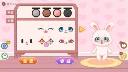 可为小兔子选择萌趣装扮,搭配大眼睛、调整妆容,展现个性化创意。