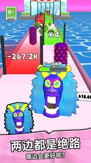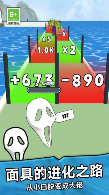 面具进化是一款将跑酷与角色养成深度融合的休闲游戏。玩家操控角色在随机生成的赛道中奔跑,途中会遇到影响面具形态的数字、符号等元素。通过正确计算或选择,可激活面具的进化机制,提升其抗伤害、加速等属性。每个关卡设置不同难度系数,后期需同时应对多重障碍与限时挑战。游戏内含50+种面具造型,部分稀有面具需完成特定成就解锁,搭配每日任务与隐藏关卡系统,确保长线可玩性。