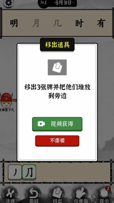 1、观察汉字找消除元素,将合适三张卡牌放一起消除。