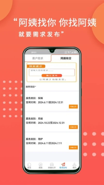 2.需求发布功能,支持用户发布需求,让阿姨主动联系,精准匹配。