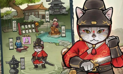 采用传统水墨笔触构建场景与角色,猫咪服饰融合花纹与配色设计,打造兼具东方美学与萌系风格的视觉体验。