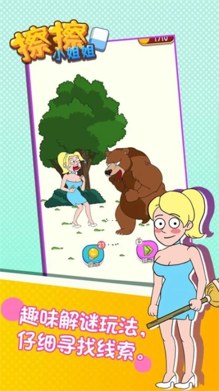 擦擦小姐姐是一款以诙谐卡通风格为核心的休闲益智游戏。玩家将化身侦探,通过橡皮擦消除画面中不合逻辑的细节,帮助角色开启全新的一天。游戏内置海量关卡,难度逐级提升,考验玩家的观察力与逻辑思维。每个场景都暗藏玄机,需要结合线索破解谜题,解锁隐藏道具。操作简单却充满挑战,适合喜欢轻松解谜的玩家。