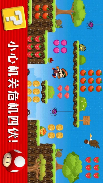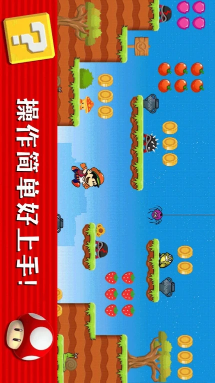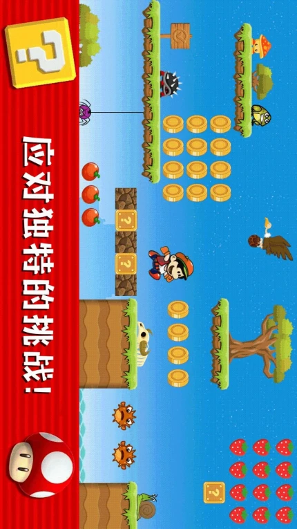 酷跑大挑战由蓝天下载网为您免费提供,这是一款以经典超级玛丽形象为核心的休闲闯关游戏。玩家将操控熟悉的角色在多样化的关卡中进行跑酷挑战,沿途收集苹果、草莓、金币等精美物品,同时躲避危险动物与陷阱。游戏采用简单操作模式,通过快速反应与精准跳跃完成关卡目标,适合追求轻松娱乐与挑战并存的玩家群体。