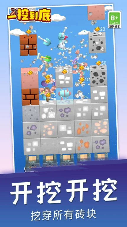 蓝天下载网为您免费提供一挖到底手游下载。一挖到底是一款超有趣的休闲益智类挖掘游戏,玩家能在游戏中体验到挖掘、鉴宝、闯关等多样玩法。在游戏里,你可以利用钻头、炸药等工具破坏砖块,寻找隐藏其中的宝物,开启鉴宝模式确定宝物价值。丰富的玩法融入全新元素,带来无尽挑战乐趣,完成任务还能获得丰厚奖励,助力后续关卡。无论是对挖掘游戏感兴趣,还是想体验鉴宝乐趣,一挖到底手游都值得一试。