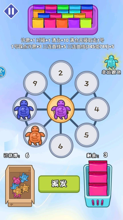 1.基础消除:划动屏幕连接3个及以上同色乌龟,消除后下方乌龟自动填补空位。