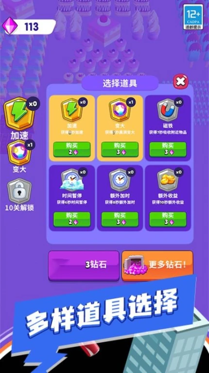 通过挑战关卡,玩家可逐渐赚取更多钻石,用于购买所需物品。