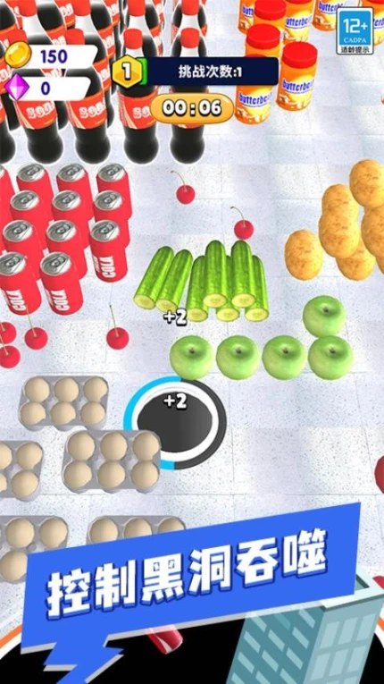 1、控制黑洞吞噬物品,观察画面找最佳吞噬路线,获更多机会。