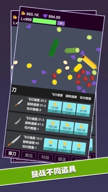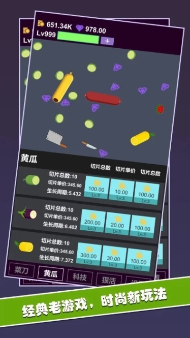 黄瓜茄子切切切是一款别具一格的休闲游戏,它将经典的切水果玩法进行了创新。游戏里呈现的物品丰富多样,不仅仅是常见的水果,还有钻石、香肠等。玩家在切割水果的过程中能获得对应的金币,水果生长周期长还能获取成倍金币。游戏设置了多种刀具,如菜刀、水果刀等,玩家可通过接金币提升刀具等级。游戏结合了新奇的挑战玩法,让玩家体验不一样的挑战感受,尽力切中更多水果就能收获不同奖励。