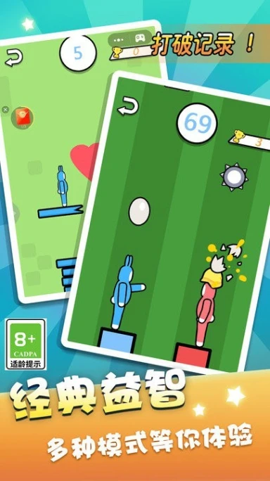 2、双人挑战模式包含同步跳跃、接力蹦极等创新玩法,支持本地联机与在线匹配,竞技过程充满策略博弈。