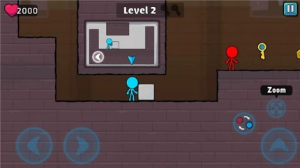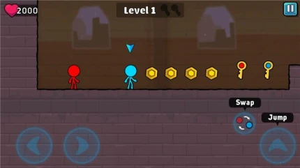 红蓝火柴人2采用双角色操控机制,红色火柴人象征火元素,蓝色代表水元素,两者需配合激活机关、躲避障碍。游戏场景包含迷宫、地牢等多样化地图,任务目标涵盖寻宝、解锁出口及收集皮肤。操作界面简洁直观,触控响应灵敏,支持金币吸附与道具卡拾取功能,关卡难度逐级提升,奖励系统丰富。
