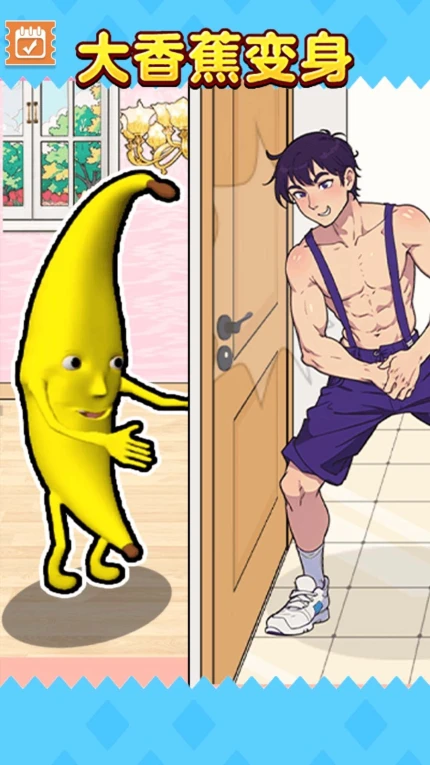 香蕉人与变身人物间隔着门或墙,玩家需找到合理变身方式突破阻碍。