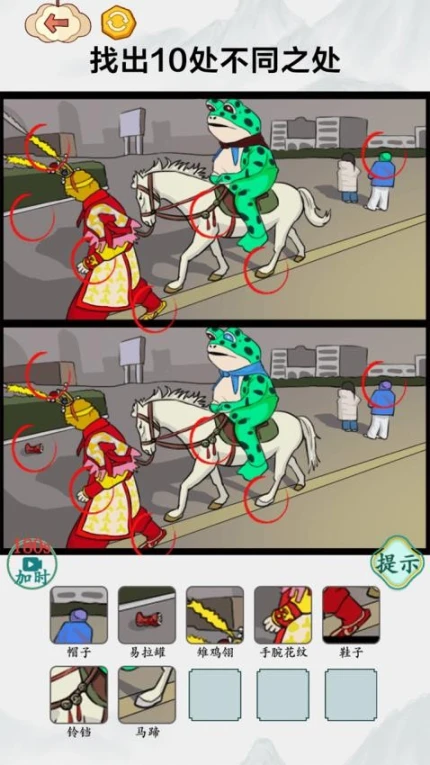 《找到10处不同》是一款趣味性十足的休闲益智游戏。玩家进入游戏后,要在一幅幅相似的图片中找出10处不同之处。游戏关卡丰富多样,随着进程难度逐渐提升,不断考验玩家的观察、发现能力和耐心。游戏场景中不仅有隐藏的细微差别,还融入奇怪元素和爆笑场景,像古代场景里出现电风扇、收音机等超现实物品,为玩家带来独特惊喜。玩家在限定时间内完成挑战可获取奖励、解锁道具,轻松完成各种挑战,享受游戏乐趣。