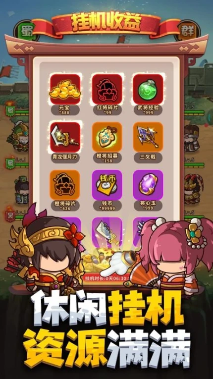 玩家在挂机离线状态下也能收获丰富资源,如元宝、红将碎片等,节省时间精力。