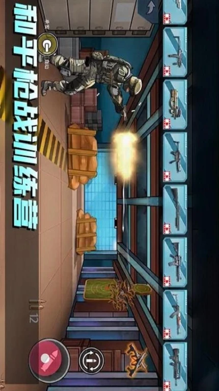 1、通过虚拟摇杆控制角色移动,点击屏幕右侧开火键进行射击,长按可切换为连发模式。