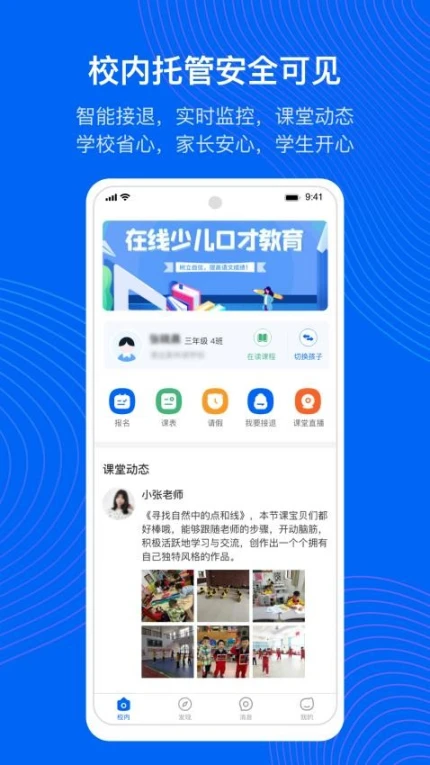 3.动态查看:提供学校课堂动态信息,家长可随时查看孩子的学习情况。