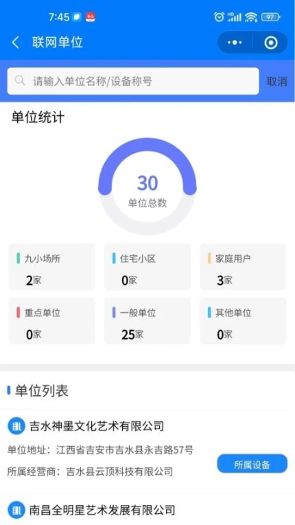 支持多级单位账户体系,上级单位可查看下属分支机构设备运行数据。
