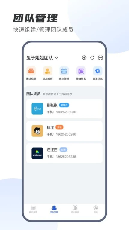 5.团队管理:管理排班团队成员的个人信息,方便团队协作。