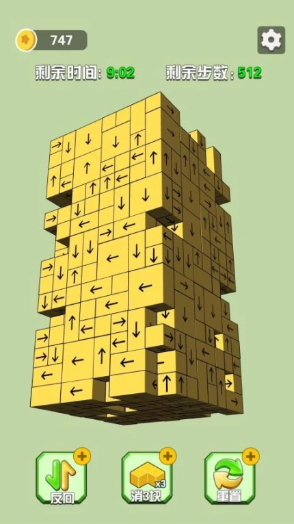3.多类道具助力:提供返回、消三块、重置等道具,根据情况灵活选择。