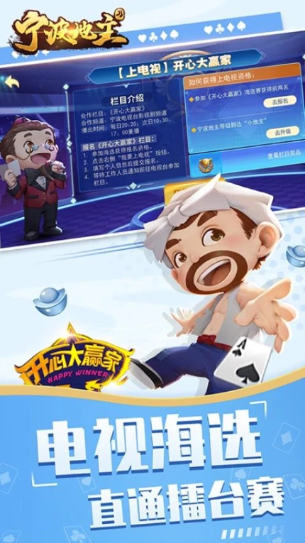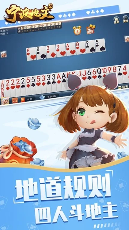 蓝天下载网为您免费提供宁波地主下载。这款专为宁波玩家打造的棋牌桌游,以四人斗地主为核心玩法,融入地方特色配音与创新模式。高清画面与丰富奖励机制,让玩家在熟悉规则的同时体验多样化的竞技乐趣。无论是好友约战还是电视赛事,都能找到属于自己的欢乐场域。