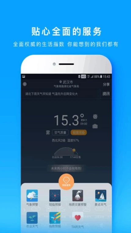 e天气官方版是一款由湖北省气象局打造的天气服务应用,为市民提供了便捷的天气查询体验。它采用精准定位技术,能为用户提供所在位置的精确天气预报,包括实时天气、降雨预报和空气指数等信息。用户可通过它及时了解天气动态,合理规划出行。此外,应用还提供天气资讯、美图欣赏、服务订阅和天气统计等功能,满足用户多样化的需求。丰富的服务内容和实用的功能,让e天气官方版成为用户生活中不可或缺的天气助手。