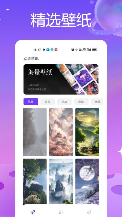 应用内嵌专业视频渲染引擎,支持4K动态壁纸流畅播放。独创的帧率自适应技术可根据设备性能智能调节,确保高画质与低能耗的完美平衡。动态壁纸库包含自然景观、科幻特效、艺术动画等15个主题系列,每周新增30组精品内容。