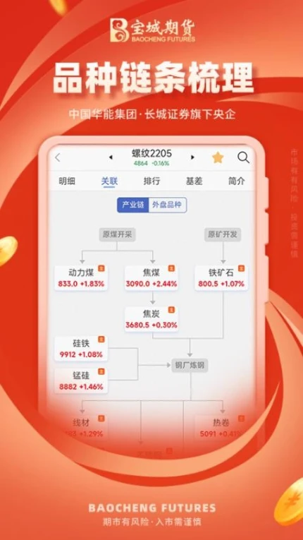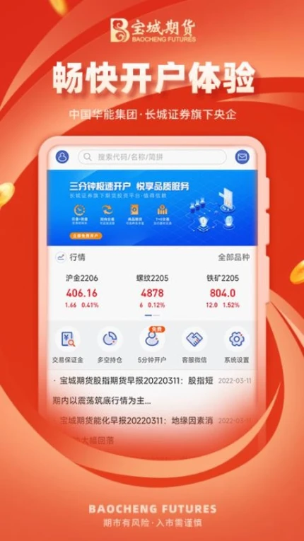 宝城期货开户交易官网版作为专业期货服务平台,核心功能涵盖极速开户、多品种交易、行情资讯推送及资产可视化管理。用户可一键完成身份认证与账户激活,系统支持商品期货、金融期货等全品类交易,实时报价延迟低于0.1秒。平台独创产业链分析模块,通过可视化图表呈现上下游价格传导关系,帮助用户建立系统化投资逻辑。