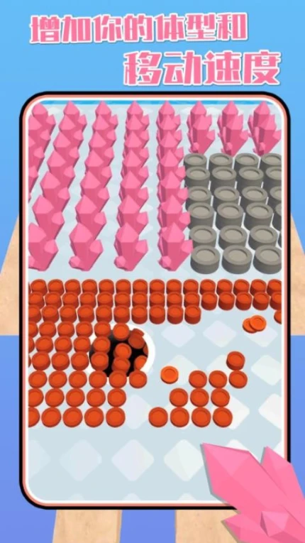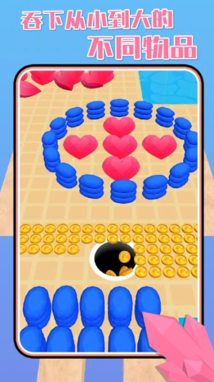 1、启动黑洞吸附功能,通过拖动控制核心位置,优先吞噬画面中最小的圆形物体。吸附范围显示为蓝色光圈,需完全覆盖目标方可触发吞噬。
