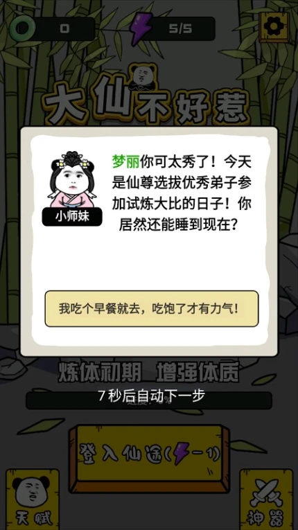 大仙不好惹构建了一个以熊猫人为主角的修仙世界,玩家需通过修炼提升境界等级。游戏包含筑基、元婴、合道等多层境界体系,每突破一个阶段都将解锁更高难度试炼。角色体质可通过修炼逐步强化,配合趣味对话系统,使战斗过程充满幽默元素。玩家可加入仙门参与弟子选拔,收集仙草灵兽并提升神器等级,最终在四海八荒的挑战中成为最强修仙者。