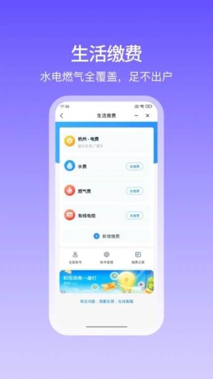 5.生活缴费:支持水电费、燃气费等多种生活费用缴纳,足不出户完成缴费。