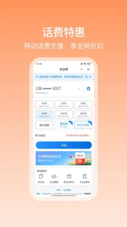 1.话费充值:支持在线为移动手机卡充值,快速到账,解决话费不足困扰。